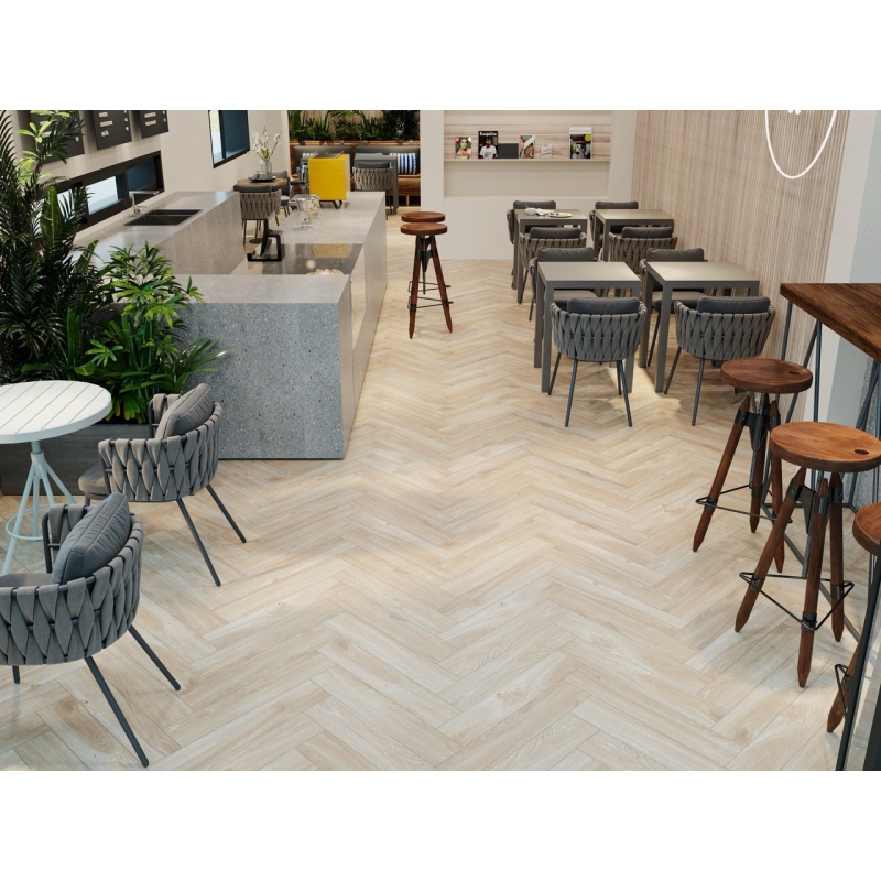 Полимерно-каменное покрытие Cronafloor Herringbone H002 Дуб Ницца с фаской по периметру для замковой укладки, толщиной 4,5 мм от Российского производителя Cronafloor. Дизайн выполнен под дерево с имитацией пола елочкой.