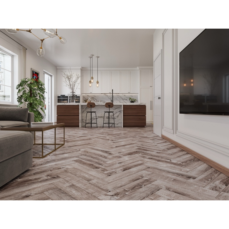 Полимерно-каменное покрытие Cronafloor Herringbone H009 Дуб Тулон с фаской по периметру для замковой укладки, толщиной 4,5 мм от Российского производителя Cronafloor. Дизайн выполнен под дерево с имитацией пола елочкой.