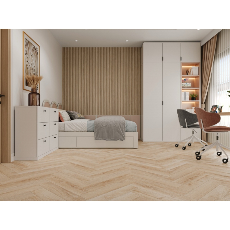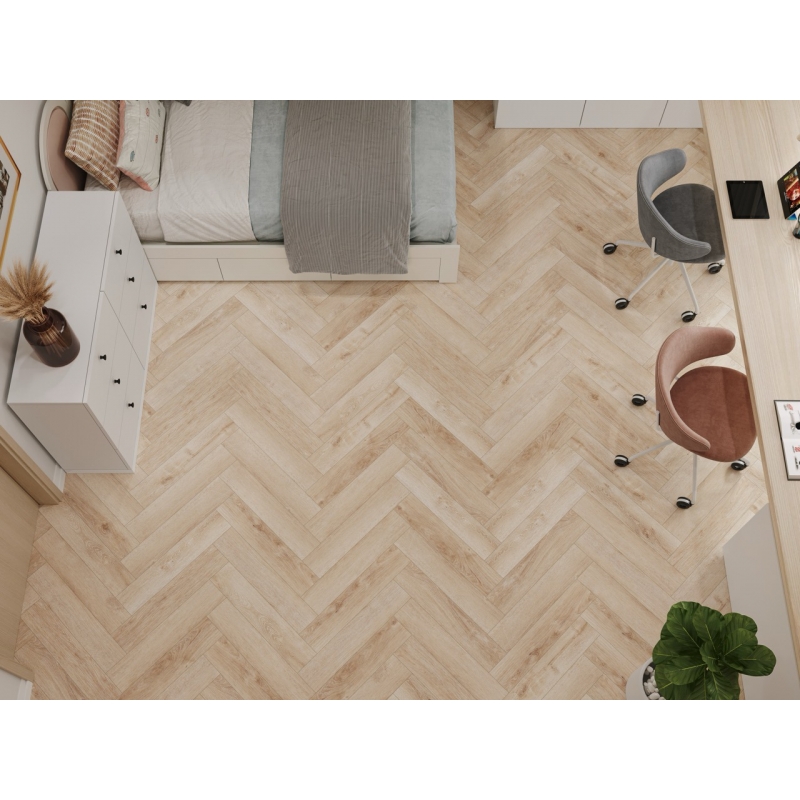 Полимерно-каменное покрытие Cronafloor Herringbone H010 Дуб Дижон с фаской по периметру для замковой укладки, толщиной 4,5 мм от Российского производителя Cronafloor. Дизайн выполнен под дерево с имитацией пола елочкой.
