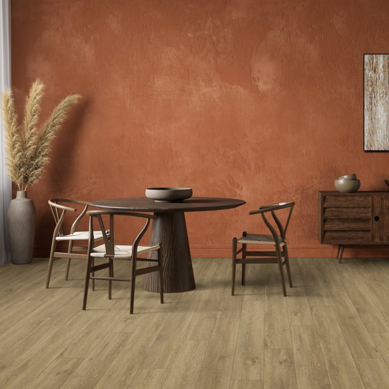 Виниловый клеевой пол ABERHOF Rhein Glue Down 1076 Nelson - ТОП уровень в классической 2 мм виниловой плитке. Главная отличительная черта - наличие тиснения поверхности в регистр! То есть, если мы видим сучок на рисунке декора, то и на ощупь тоже будет сучок! Благодаря этому эффекту, нам удаётся предельно точно сымитировать текстуру настоящего дерева, которое при этом не будет требовать особого ухода и будет стоить в разы дешевле! Классическии декор способен удовлетворить любой, даже самый изысканный вкус!